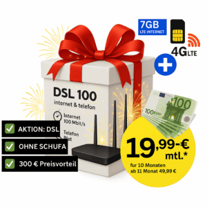 DSL-Tarif: In den ersten 10 Monaten beträgt der monatliche Grundpreis 9,99 €, ab dem 11. Monat 39,99 €. Die Mindestvertragslaufzeit beträgt 24 Monate. Sofern keine Kündigung in Textform mindestens 12 Wochen vor Ablauf erfolgt, verlängert sich der Vertrag automatisch um jeweils weiteren Monat.